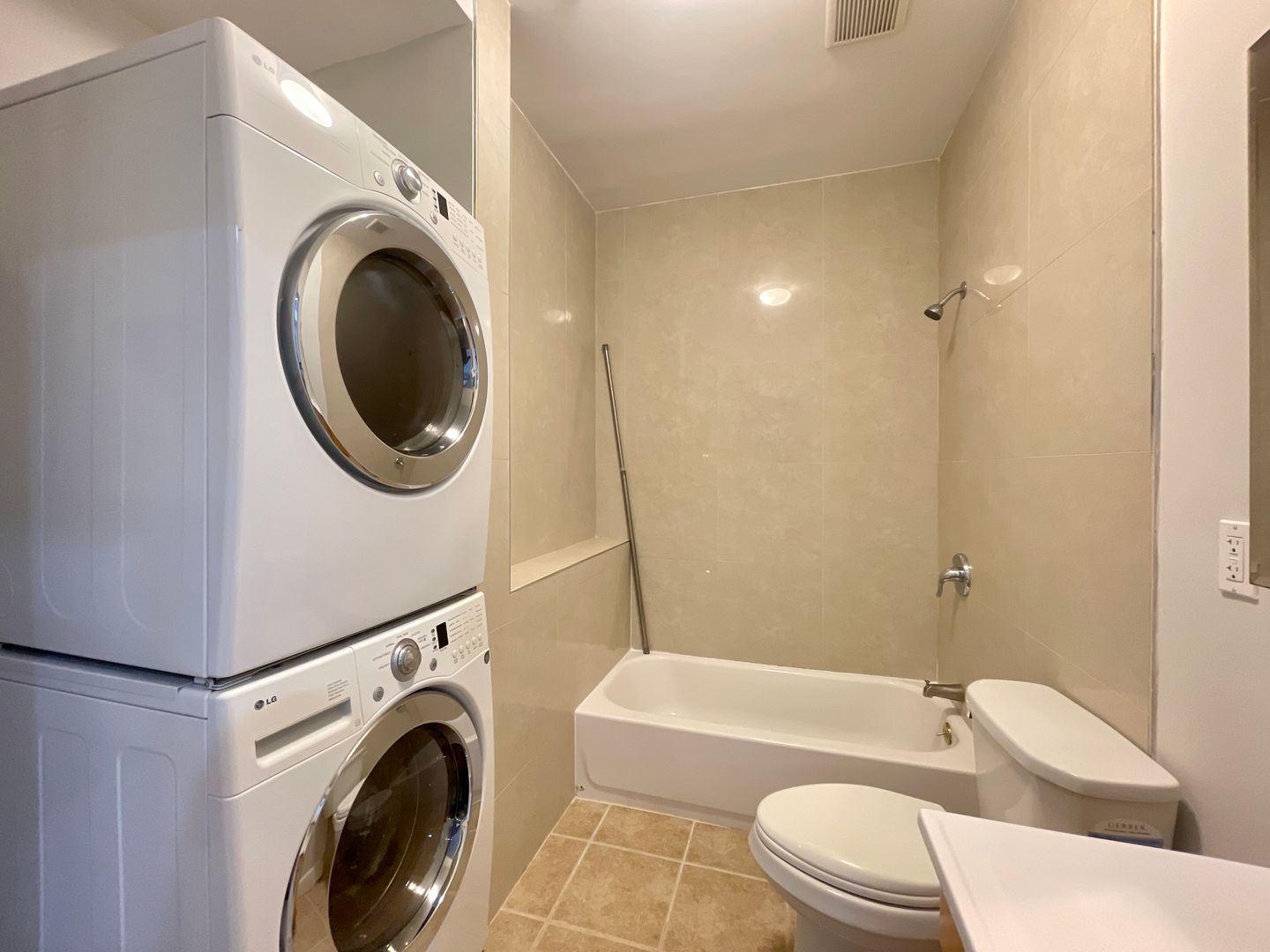 Walk in to a spacious kitchen and living room. Kitchen features quartz countertop and stainless steel appliances including a full size electric range, dishwasher, built-in microwave, and full size refrigerator. Both bedrooms are spacious and receive plenty of natural light with great views of the city. Updated bathroom with in unit washer/dryer! Hardwood flooring throughout and high ceilings!