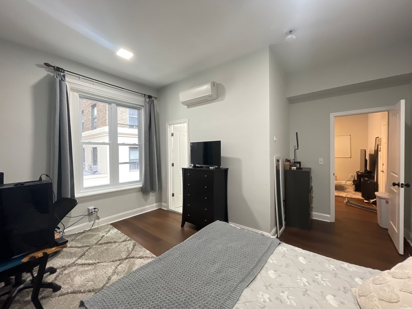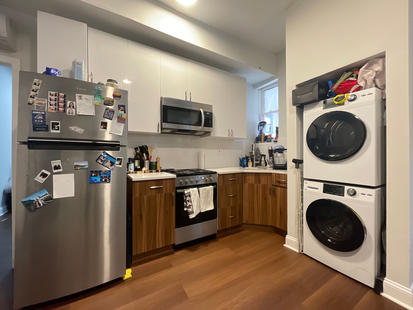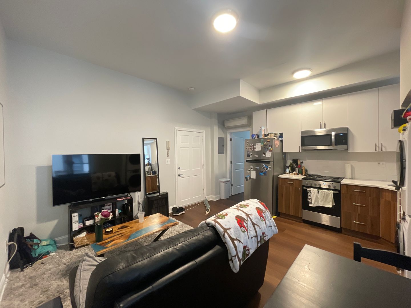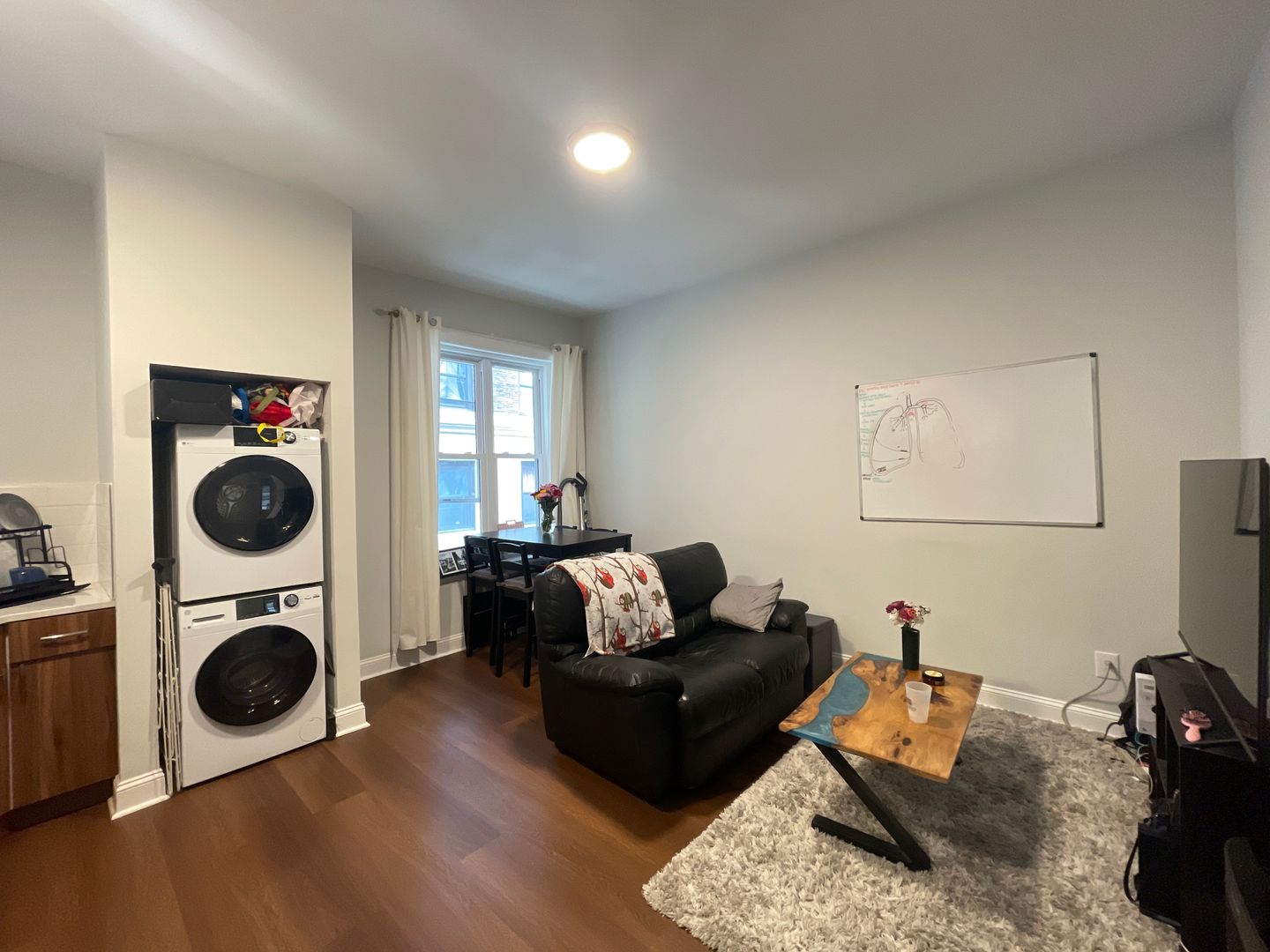 Enter the apartment to an open living room/kitchen. The kitchen features stainless steel appliances, quartz countertops, and high end cabinets. In unit washer/dryer. New windows throughout the apartment which receives a ton of natural light. Spacious bedroom that can easily fit a queen size bed, nightstands, desk, etc. Large closet in bedroom. Beautifully tiled bathroom/shower with modern finishes. Central HVAC.