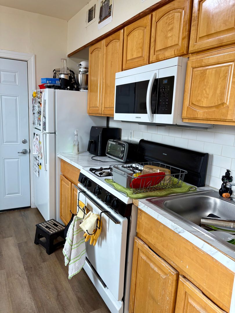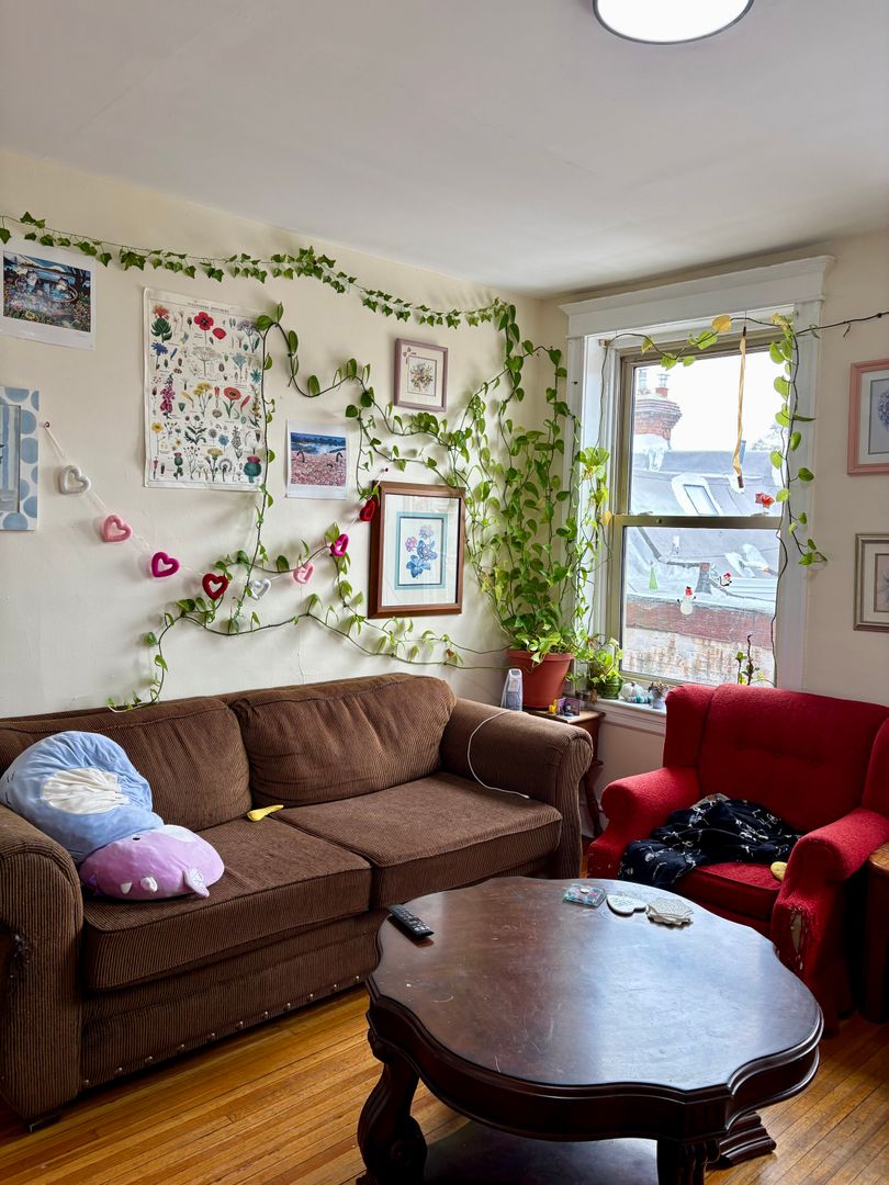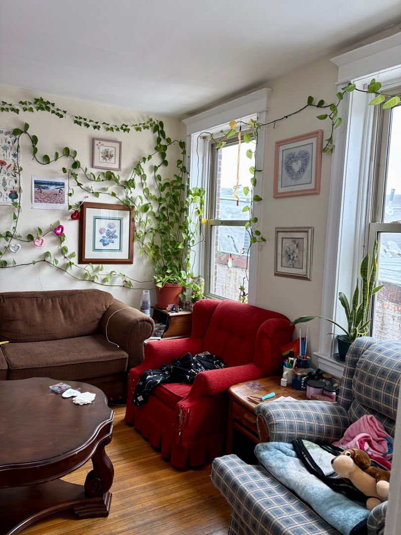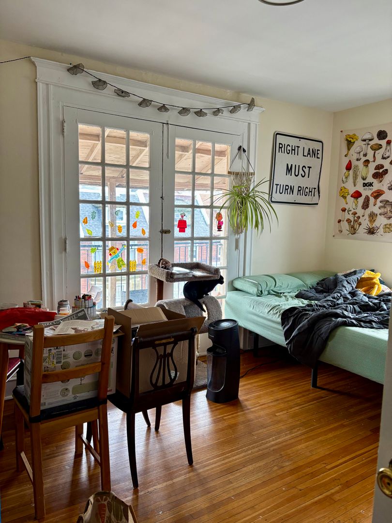 Hardwood floors throughout the apartment. Large windows in each bedroom and in living space. Ample storage spaces in the unit. Large open kitchen, great for cooking and entertaining. Front balcony/patio is a lovely outdoor addition to an already great unit! Top floor (walk up) unit.