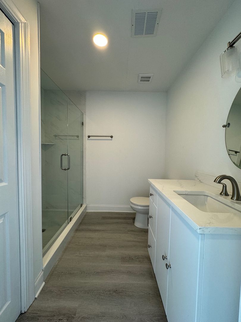 Excellent three-piece bathroom with vanity, toilet and large shower with glass door and waterfall shower head.