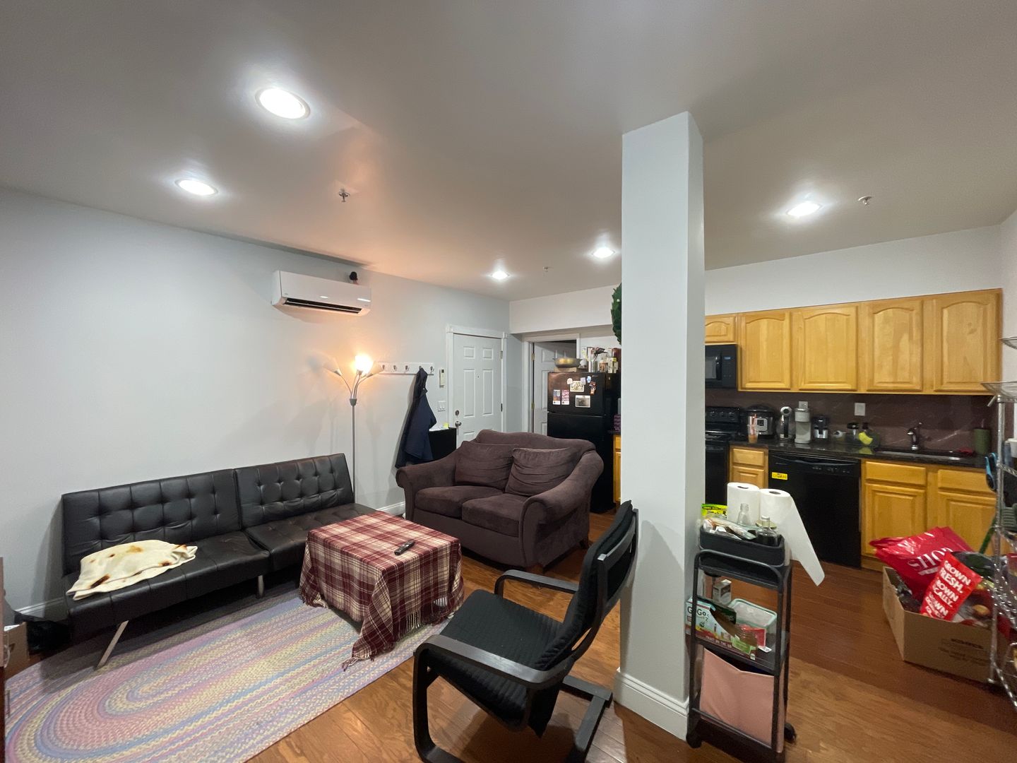 Walk in to a spacious kitchen and living room. Plenty of space for a large couch/entertainment set up and dining table. Kitchen features full size refrigerator and electric range, dishwasher, built in microwave, and garbage disposal. Both bedrooms are spacious and receive plenty of natural light with great views of the city. Updated bathroom with in unit washer/dryer! Hardwood flooring throughout and high ceilings! Central HVAC.