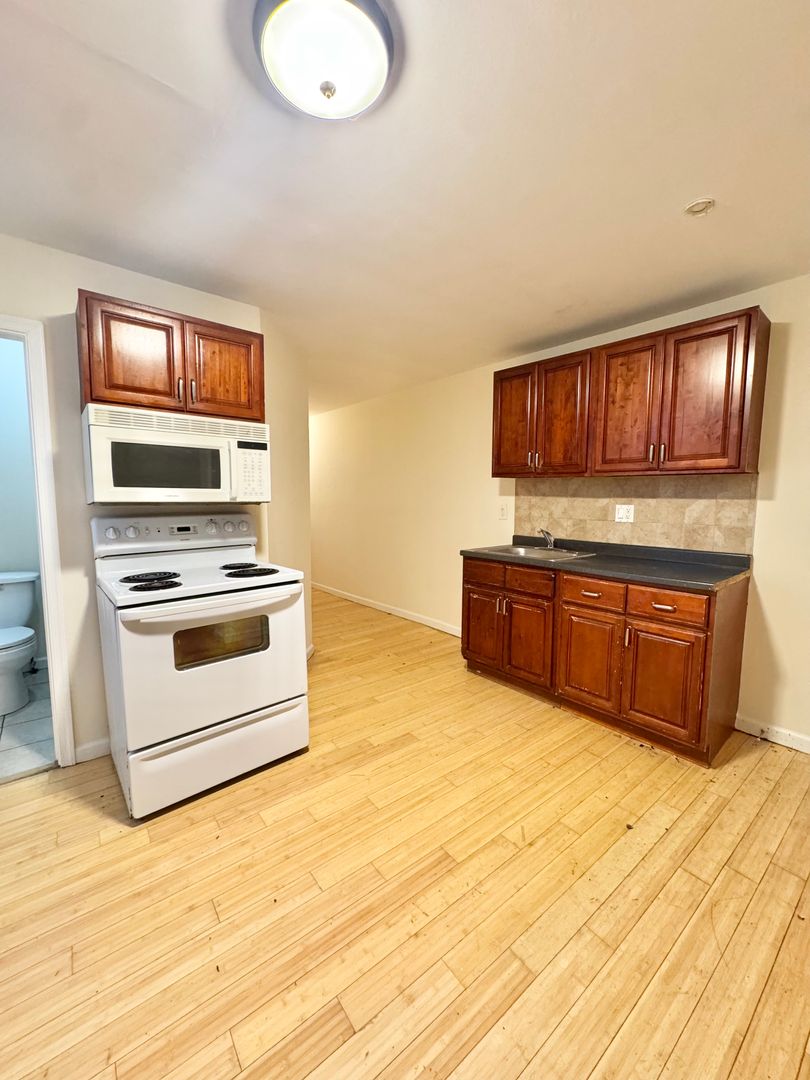 The galley-style kitchen offers wood cabinetry, a tile backsplash, microwave, gas oven/stove, and refrigerator.