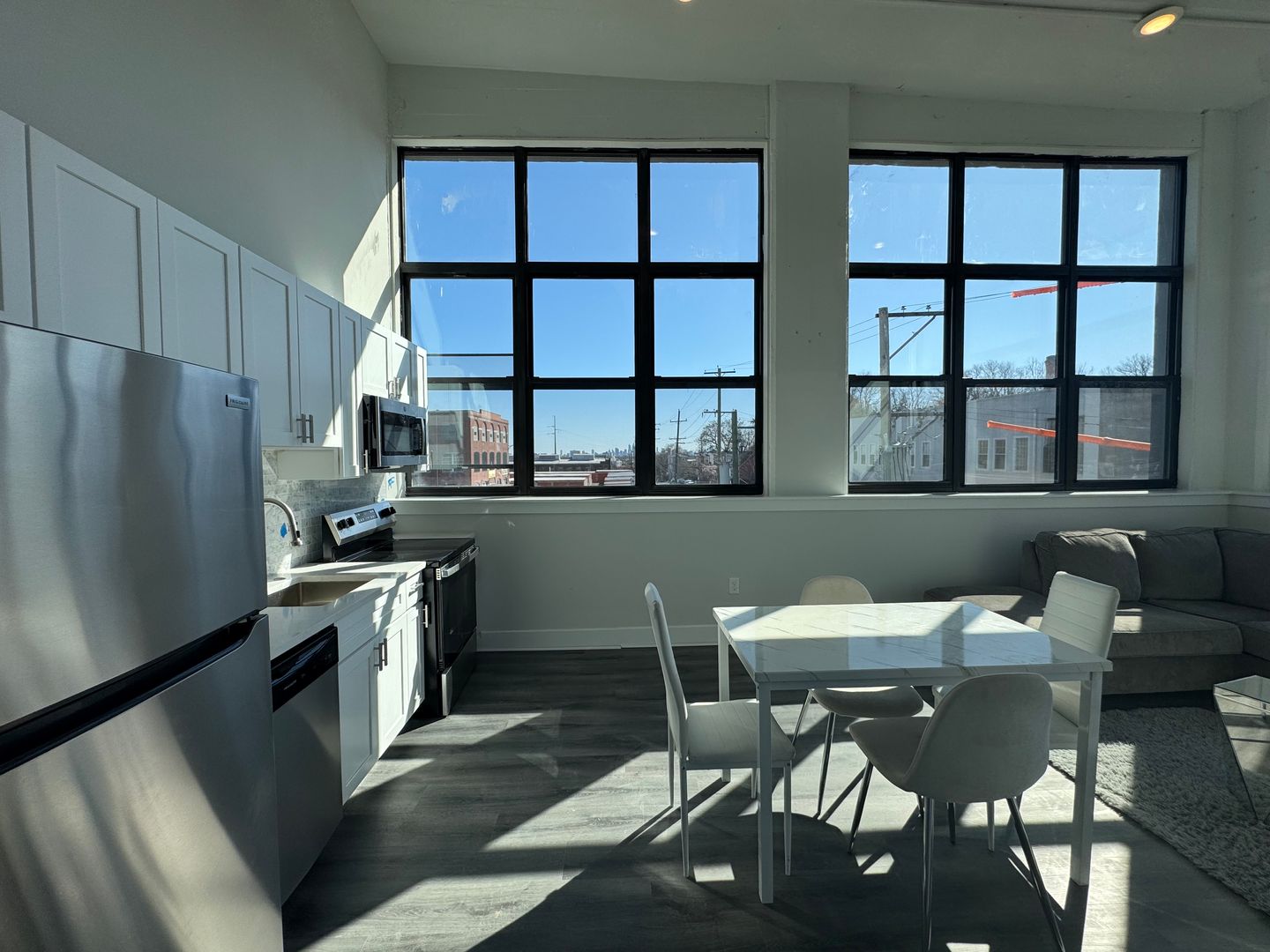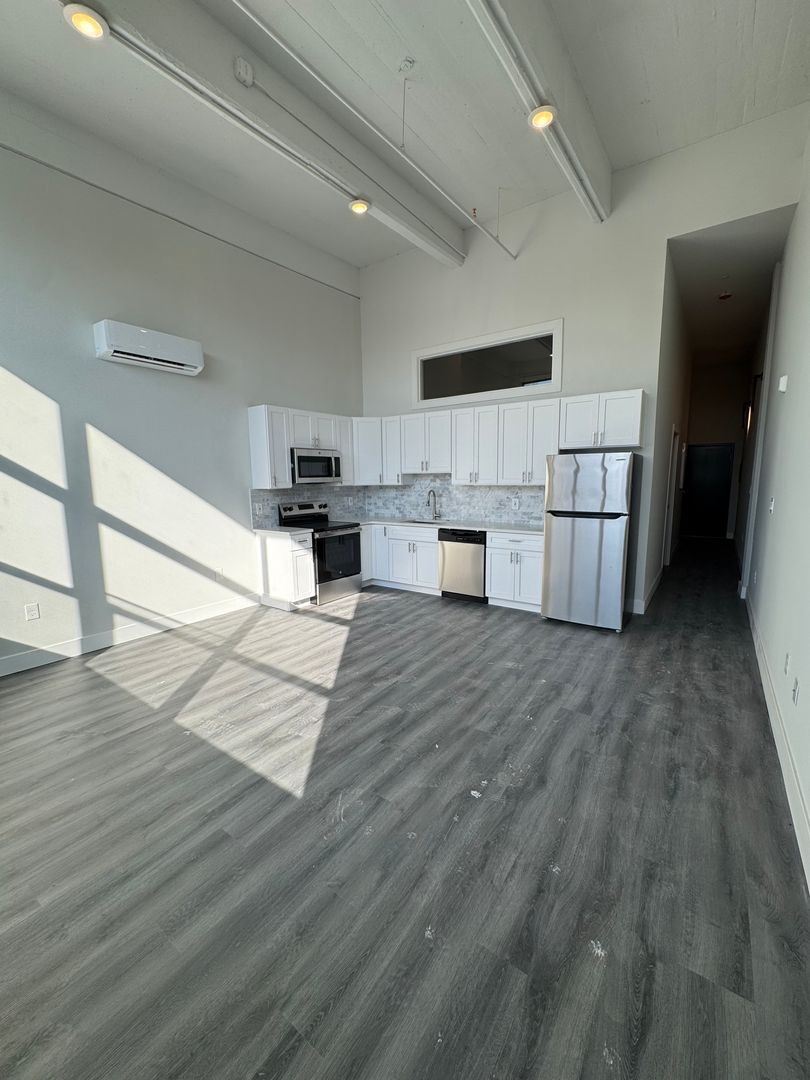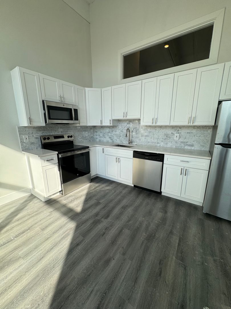 Repurposed warehouse converted into luxury apartments. Enjoy hardwood flooring throughout giving you that classic look and feel. Excellent kitchen with a TON of cabinet space, stainless steel appliances including full sized refrigerator, dishwasher µowave. Sleek kitchen design with modern cabinets, blue tile backsplash and gorgeous granite countertops, perfect to impress family & friends.
