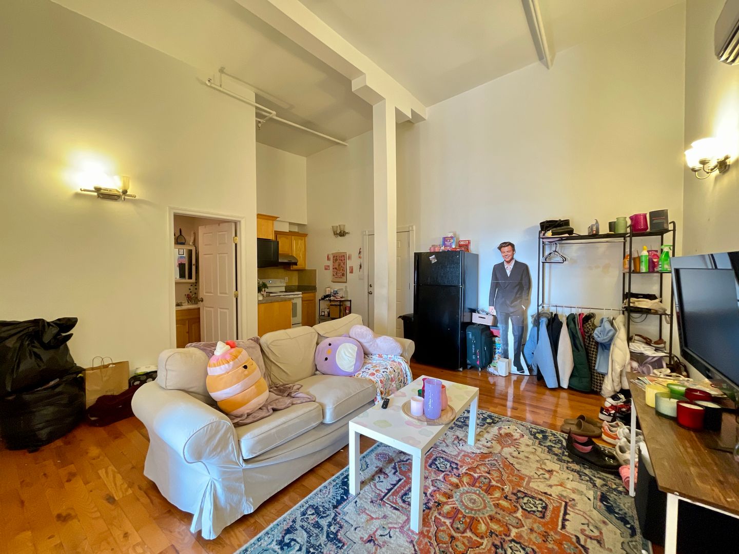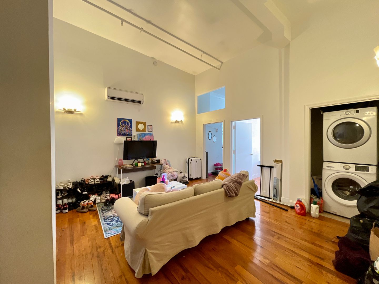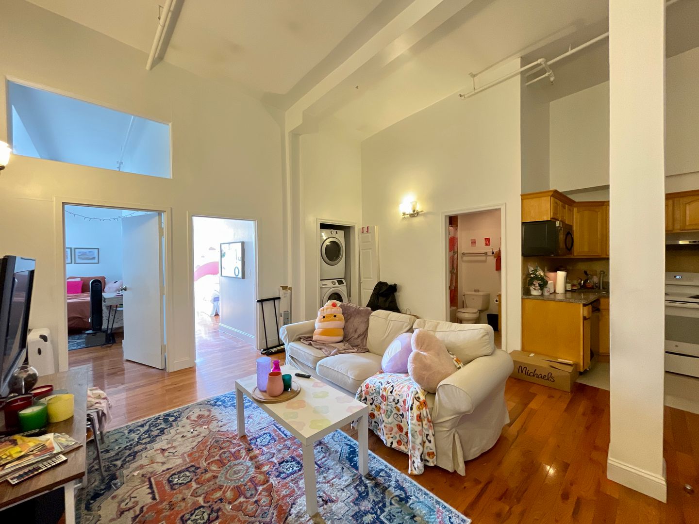 Walk in to a spacious kitchen and living room. Plenty of space for a large couch/entertainment set up and dining table. Kitchen features full size refrigerator, electric range, dishwasher, built in microwave, and garbage disposal. Both bedrooms are spacious with large closets and receive plenty of natural light with great views of the city. Spacious bathroom. In unit washer/dryer! Hardwood flooring throughout and high ceilings! Central HVAC.
