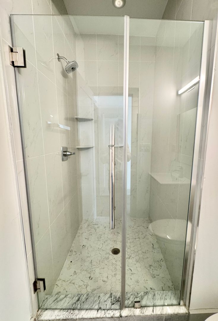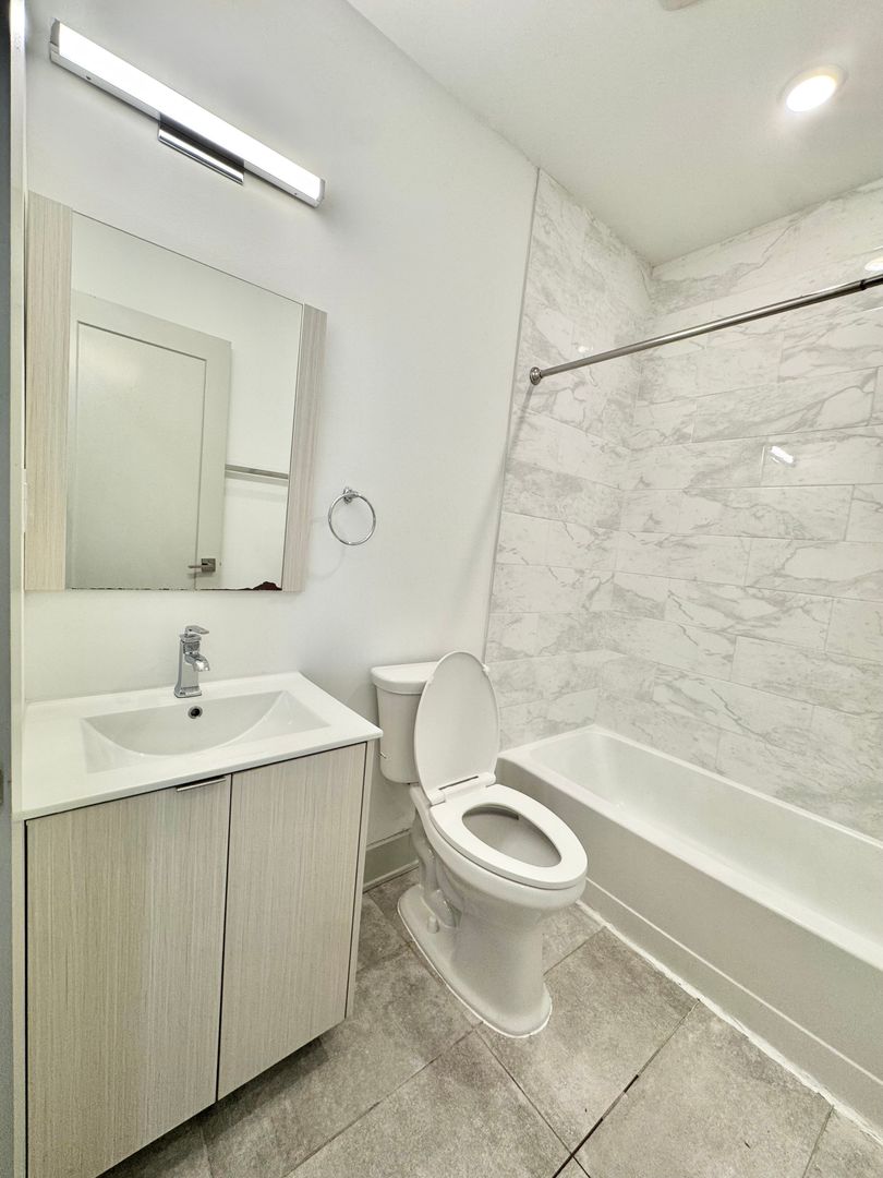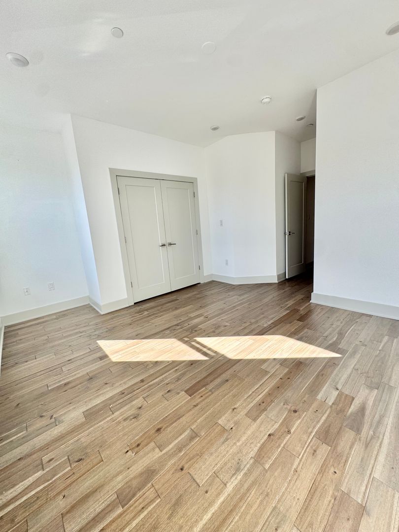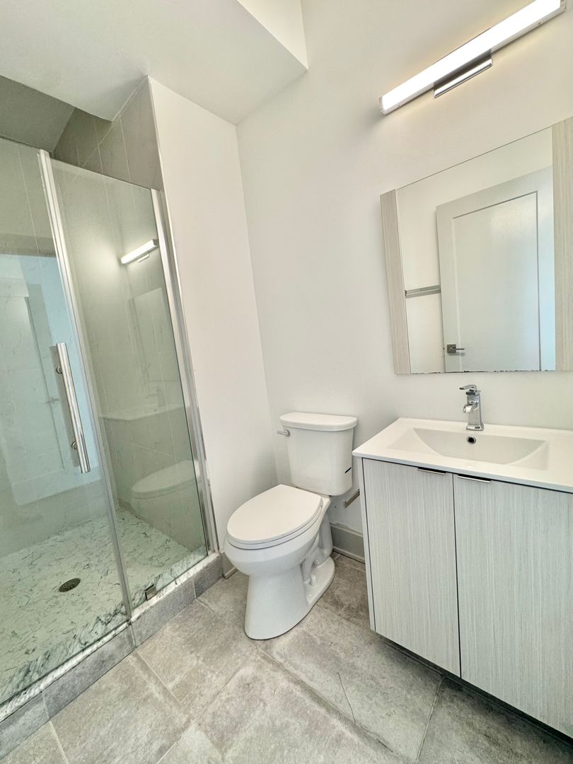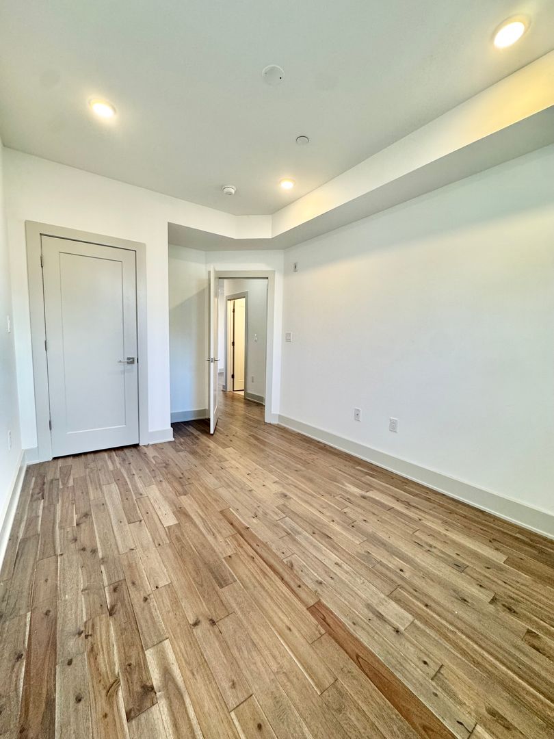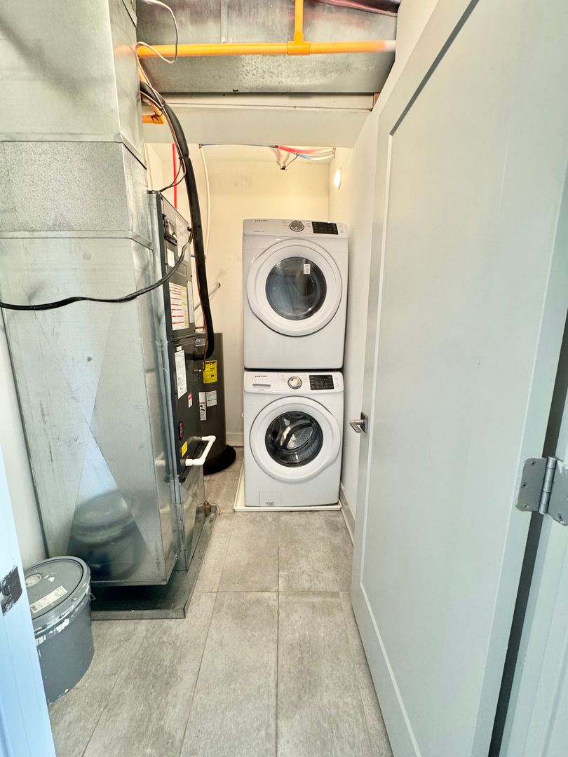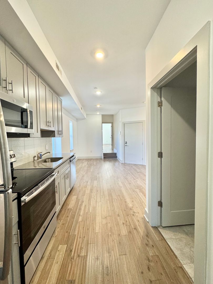 The apartment features quality flooring throughout the entire apartment. The kitchen has all stainless steel appliances and includes dishwasher, built-in microwave, garbage disposal, and full size stove and refrigerator. Each bedroom has a closet for storage. Central HVAC. In unit washer/dryer.