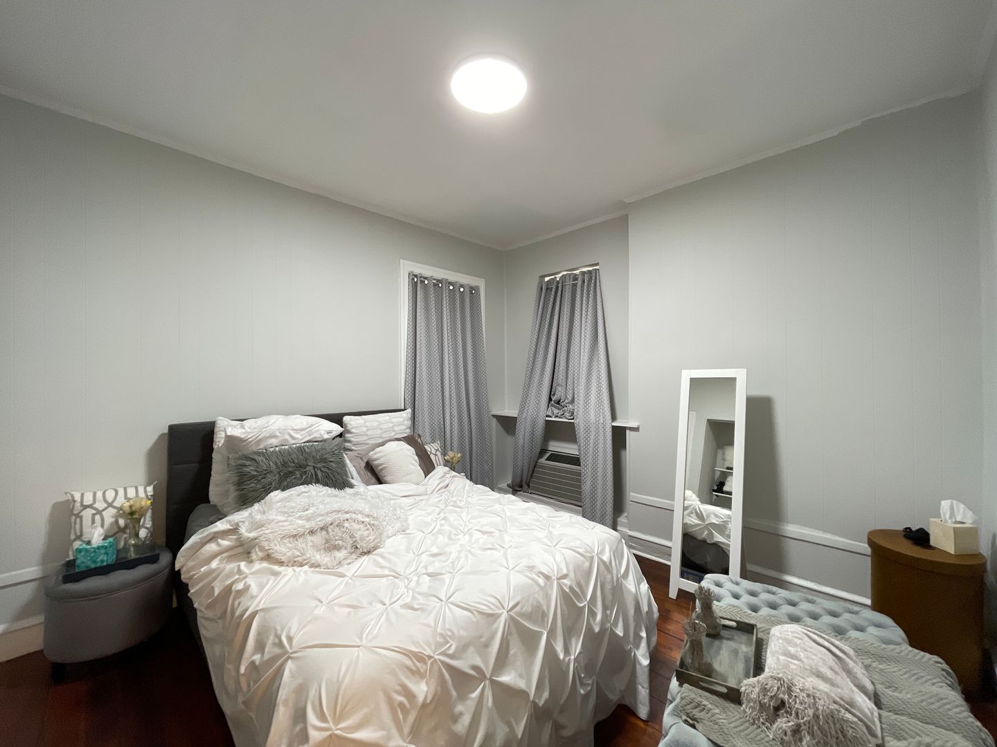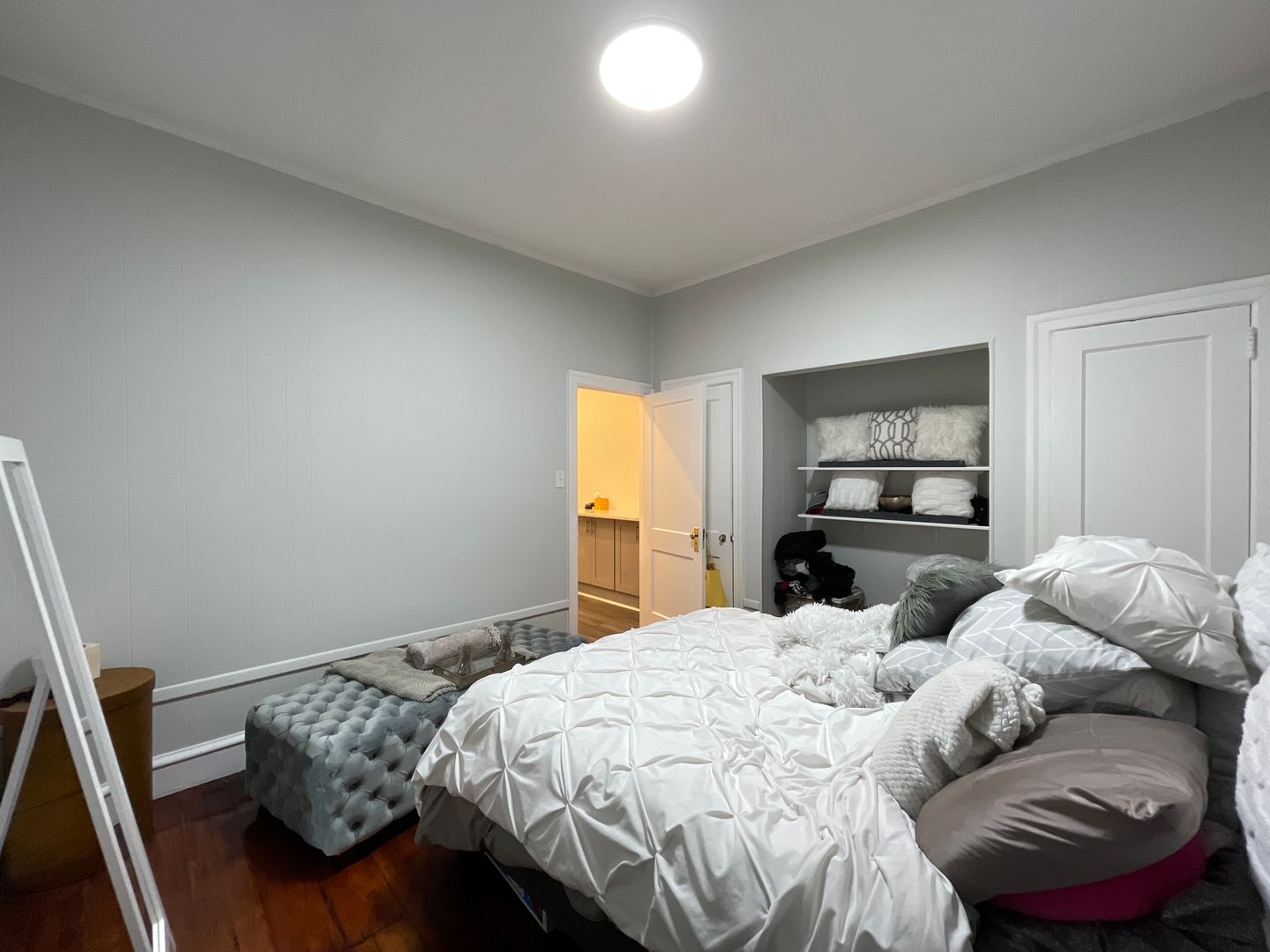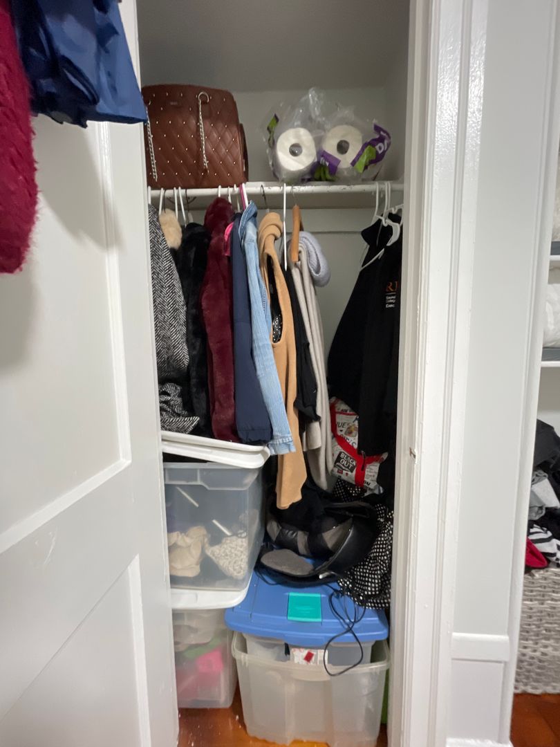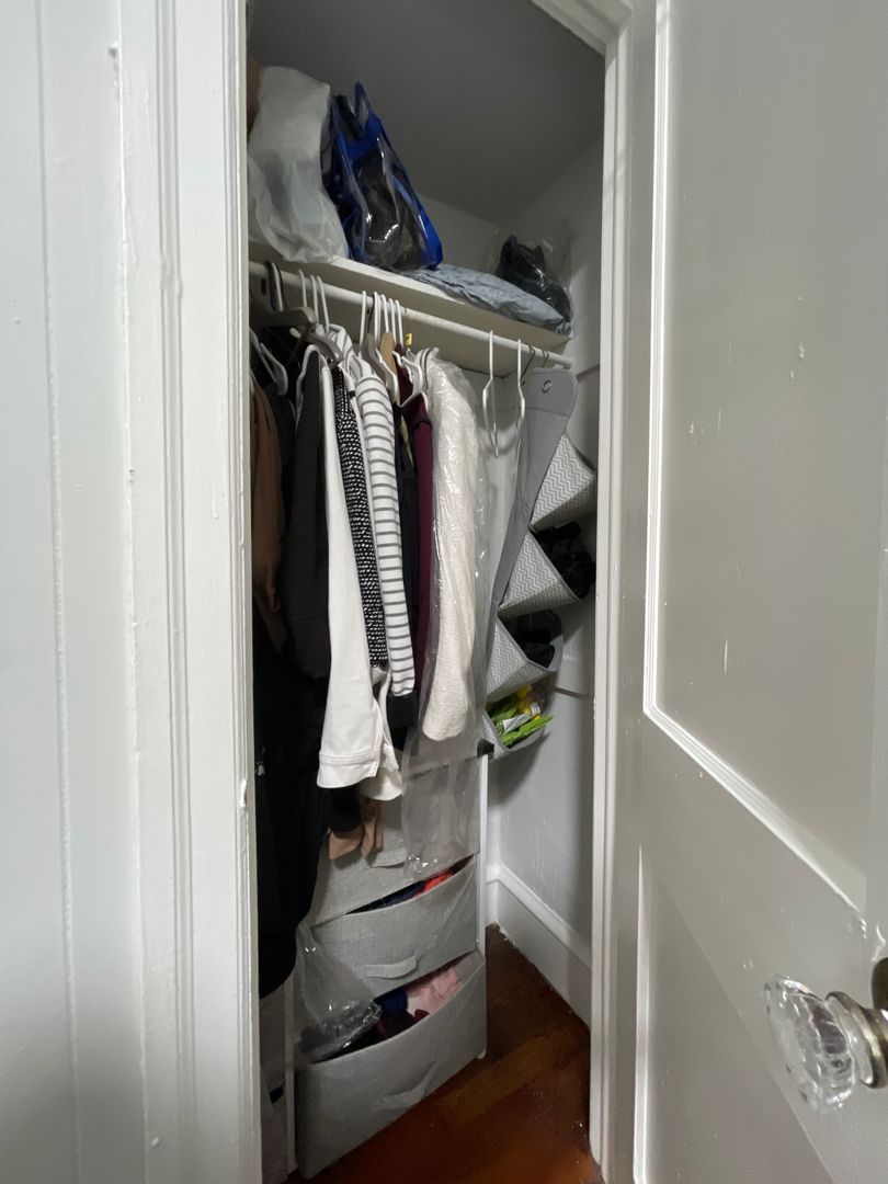 The bedroom is large and can easily fit a full/queen size bed in additional to other complimentary pieces of furniture such as night stands, dressers, or wardrobes. Two closets and a little nook with shelving are also featured in the bedroom.