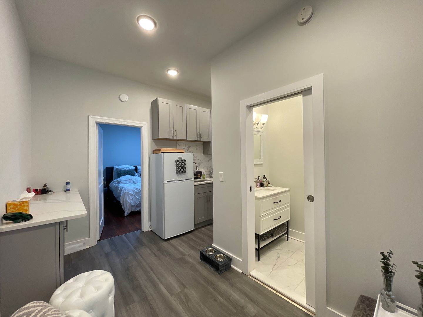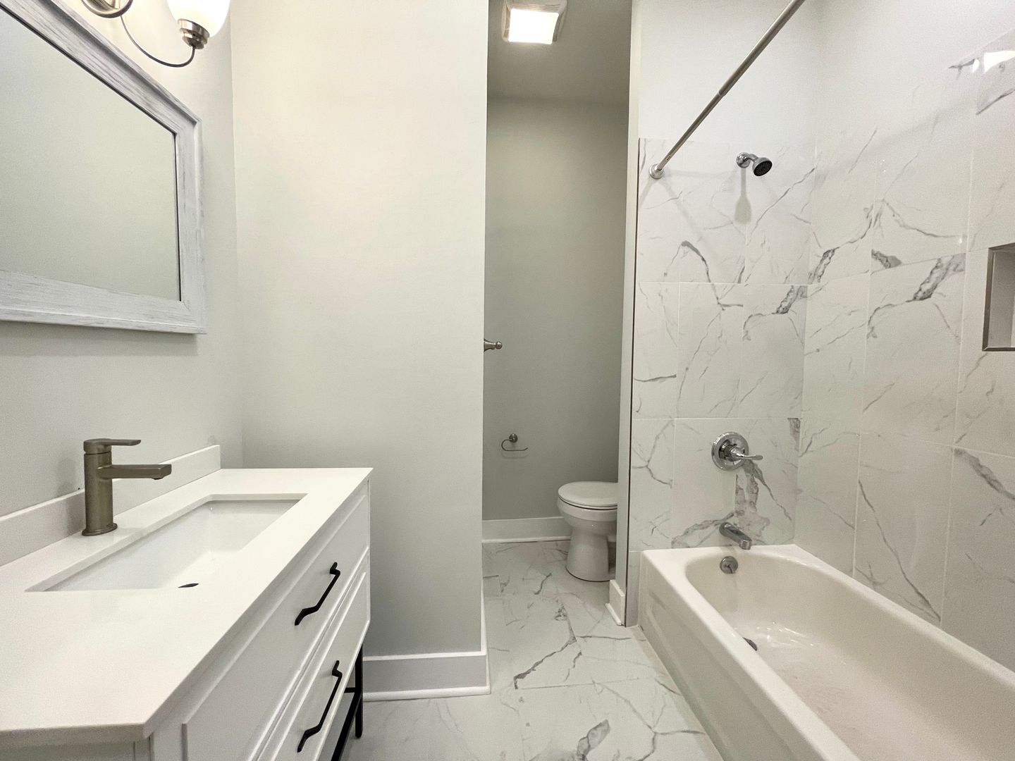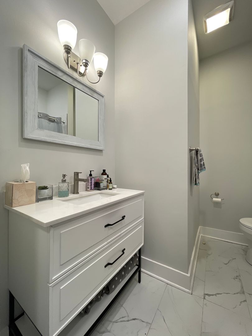 The recently renovated kitchen features quartz countertops and shaker cabinets. Kitchen appliances include a dishwasher, built-in microwave, and garbage disposal. There is also extra countertop and cabinet space in the kitchen area. The bathroom was completely renovated with tasteful finishes.
