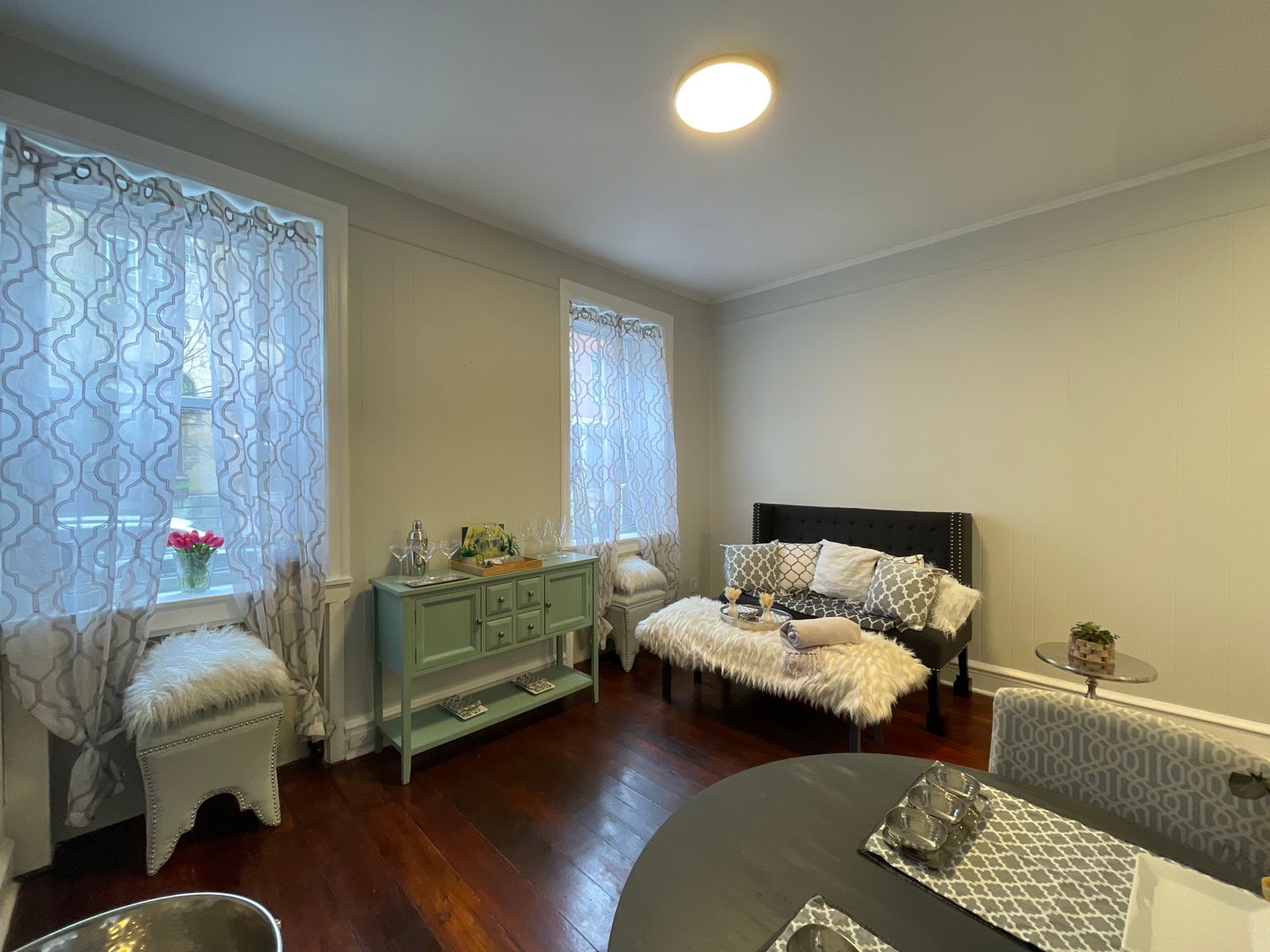 Spacious living room that can be configured to fit a comfortable entertainment set up, WFH space, and/or small dining area. The living room has two large windows that let in plenty of natural light. There is also some built-in shelving in the living room space, as pictured.