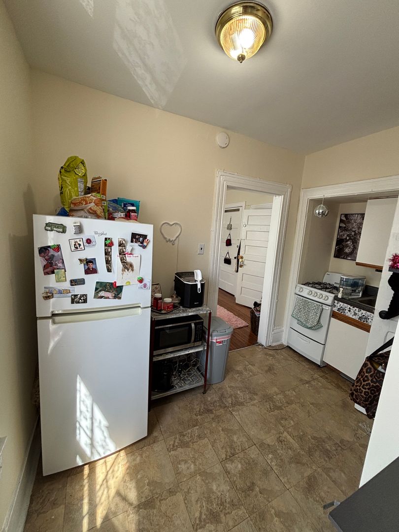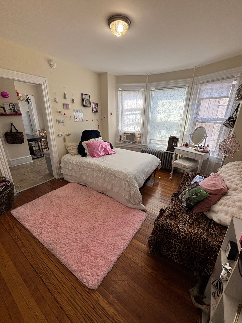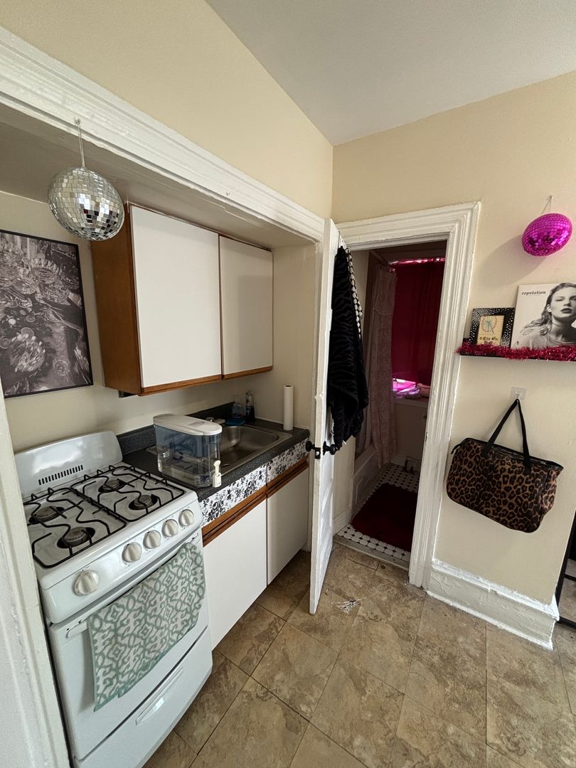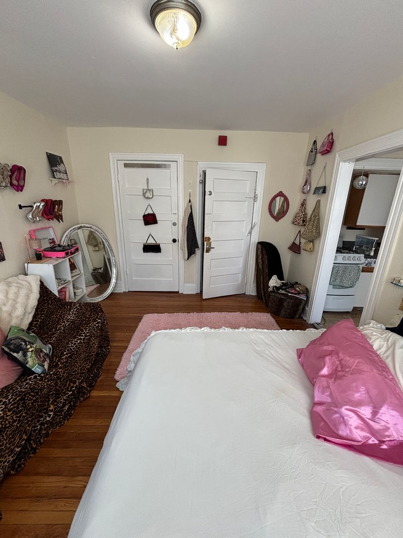 This sunny, cozy studio unit receives great natural light, features a large living/bed space, and kitchen with gas range. Beautiful hardwood floors in the main room. Extra space in the kitchen for pantry storage or small eating area. Large living space fit to hold a bed, desk and couch. Large closet in living space. Laundry services on site.