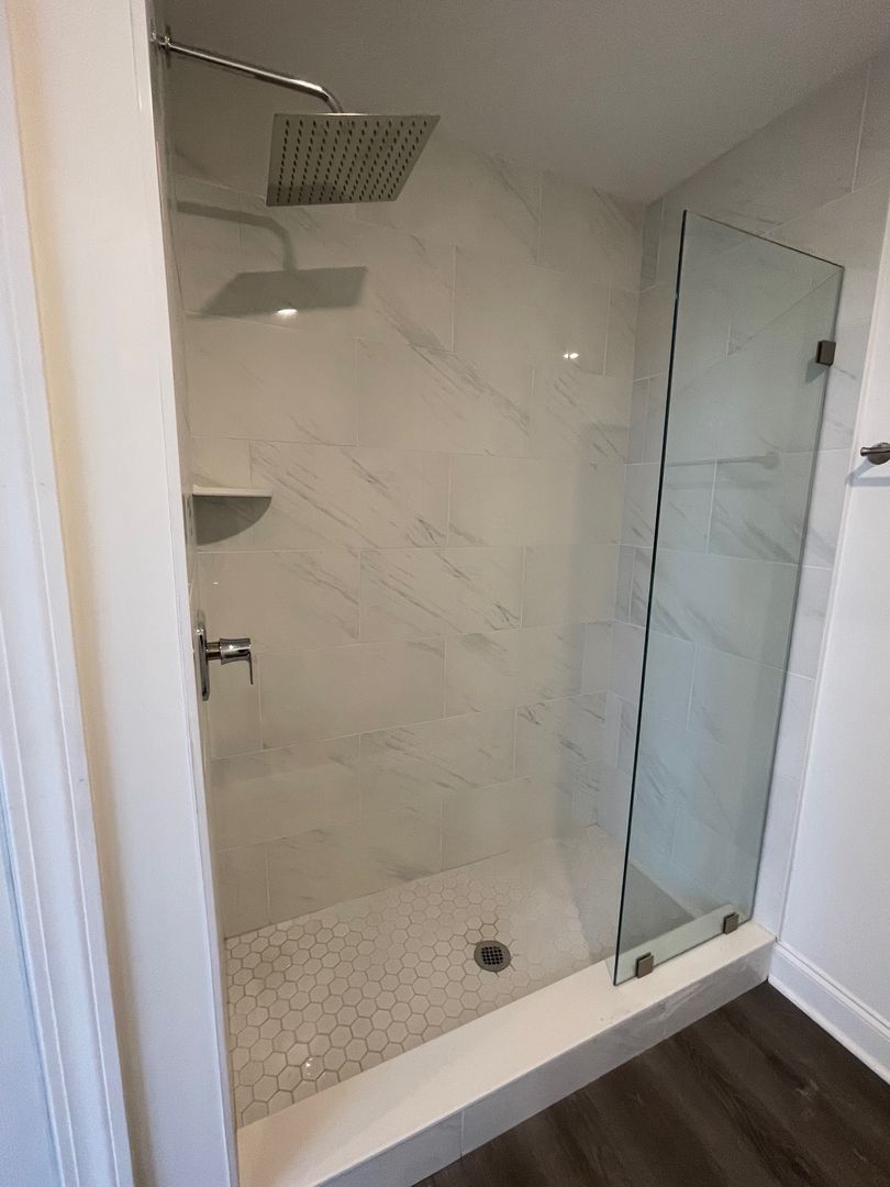 Excellent three-piece bathroom with vanity, toilet and large shower with glass door.