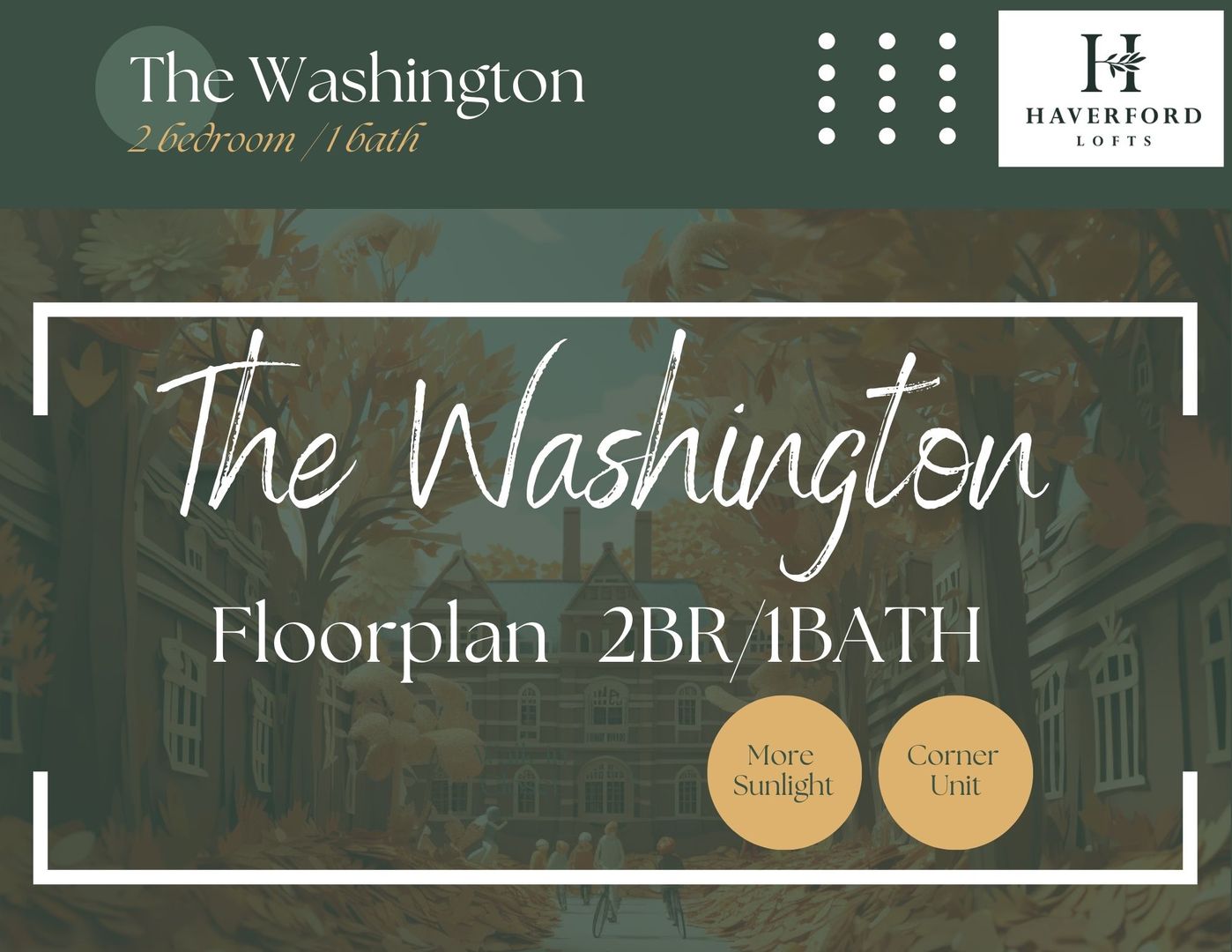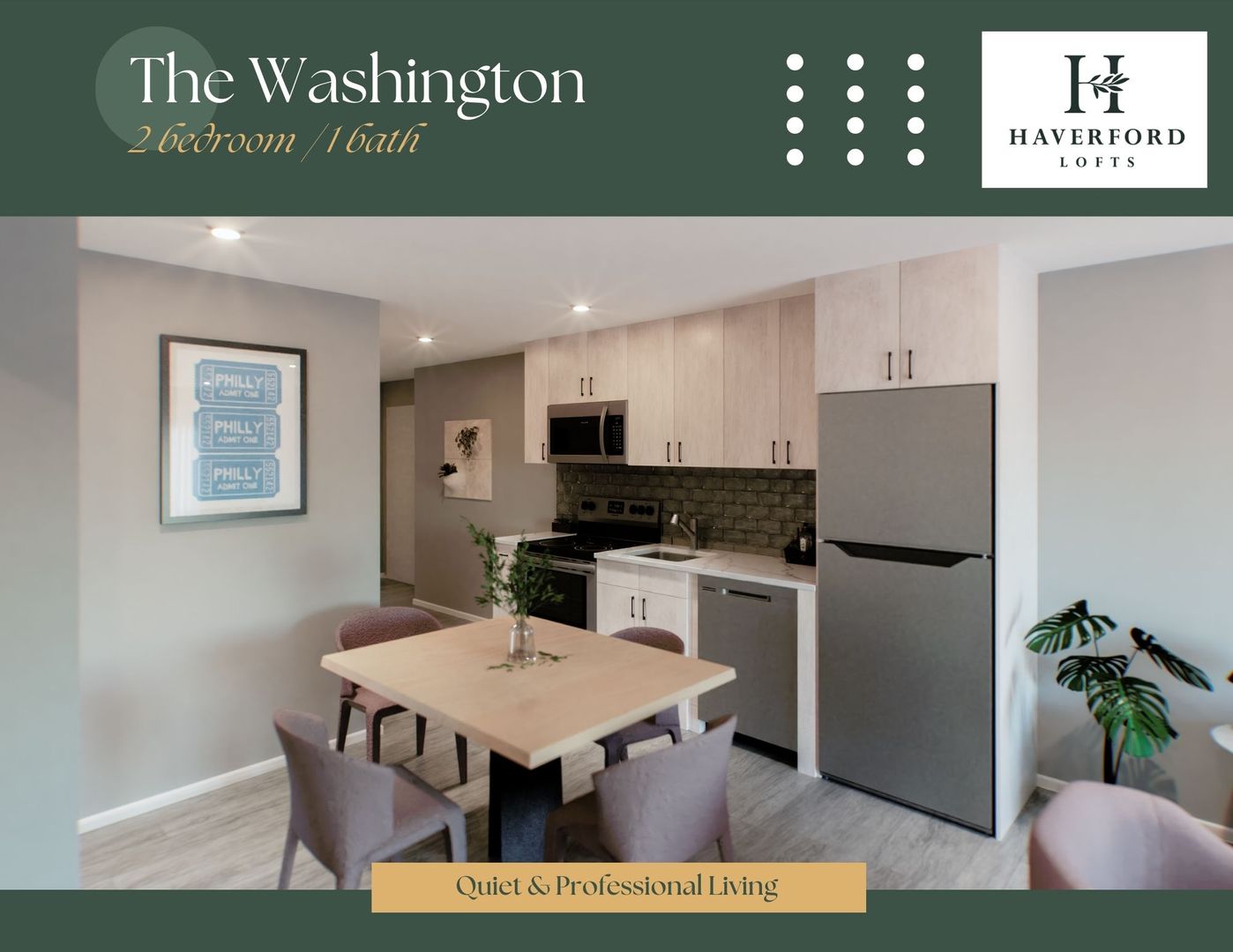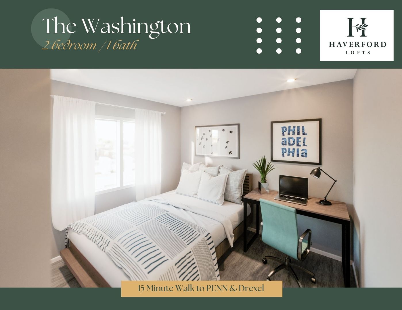 The Washington is a Luxurious 2 Bedroom / 1 Bathroom apartment that has a separated Den space, a perfect home office location! Enjoy your new kitchen with Quartz counters, new stainless steel appliances, and spacious cabinets! Designed with tons of natural light with modern, earth-tone elements. The Jackson offers walk-in closets, breakfast bars, in unit Washer/Dryer! We cater to graduate-level professionals, fellows, residents, staff, researchers, etc. Haverford Lofts also offers a professional lobby with mailroom and package area, fitness center, study lounge, indoor bike parking, and roof deck with city views. You'll love living here with close proximity to campus and the hospitals.