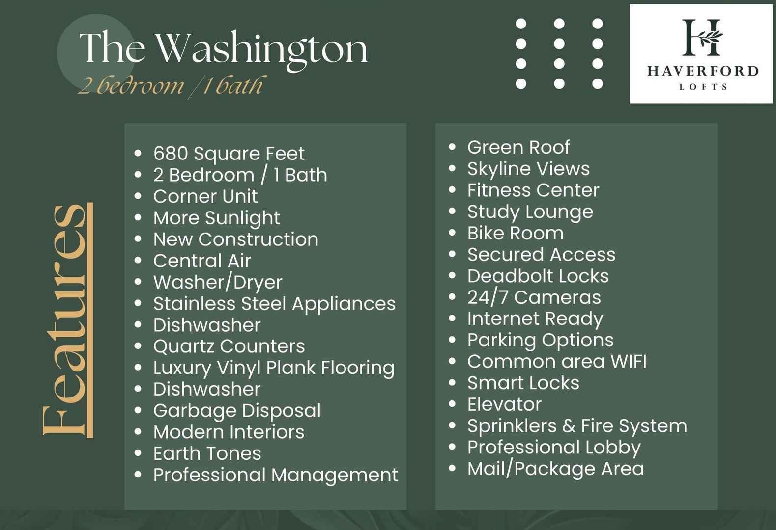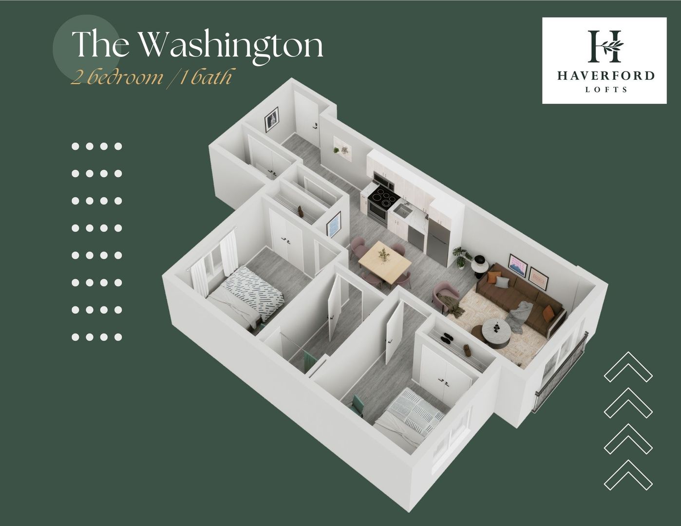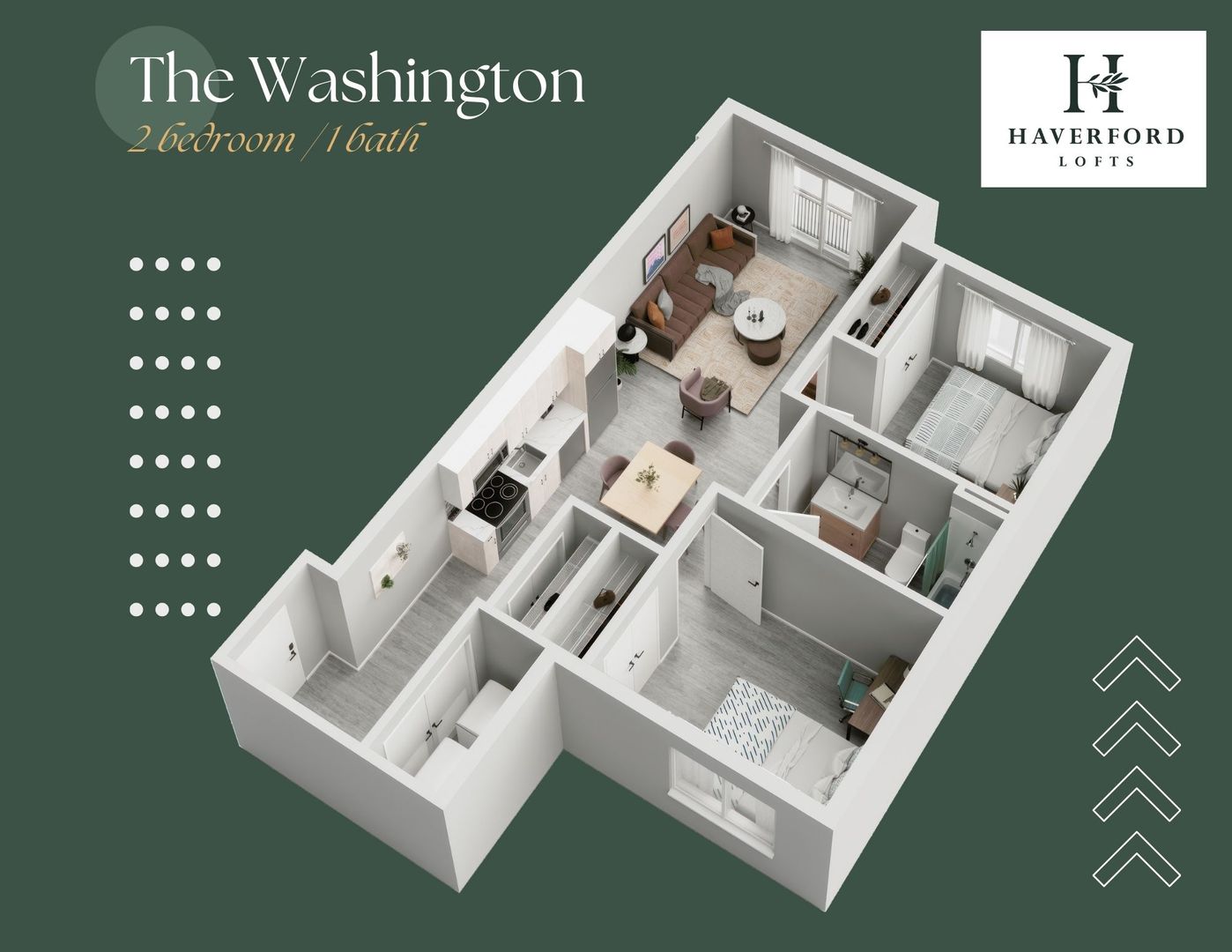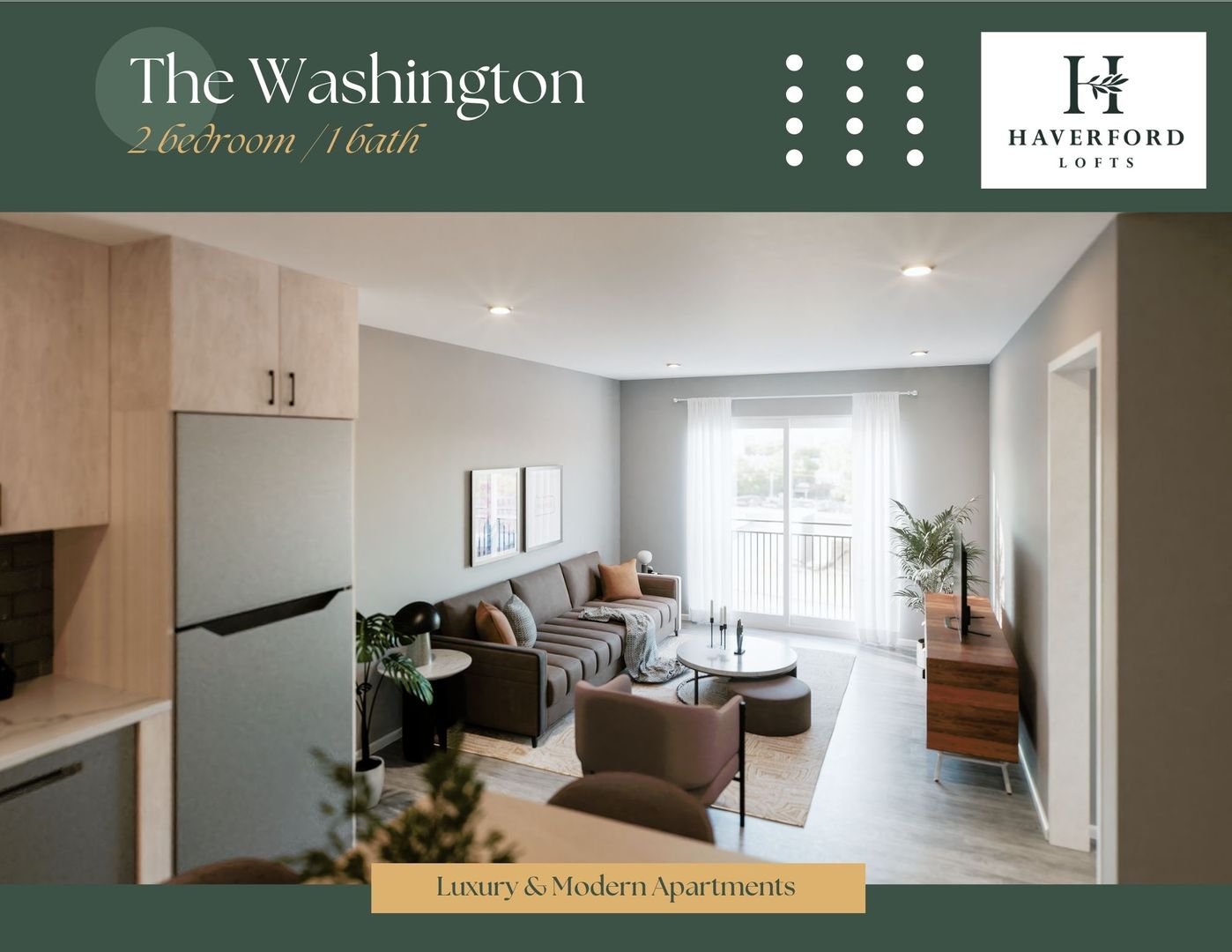 The Washington is a Luxurious 2 Bedroom / 1 Bathroom apartment that has a separated Den space, a perfect home office location! Enjoy your new kitchen with Quartz counters, new stainless steel appliances, and spacious cabinets! Designed with tons of natural light with modern, earth-tone elements. The Jackson offers walk-in closets, breakfast bars, in unit Washer/Dryer! We cater to graduate-level professionals, fellows, residents, staff, researchers, etc. Haverford Lofts also offers a professional lobby with mailroom and package area, fitness center, study lounge, indoor bike parking, and roof deck with city views. You'll love living here with close proximity to campus and the hospitals.