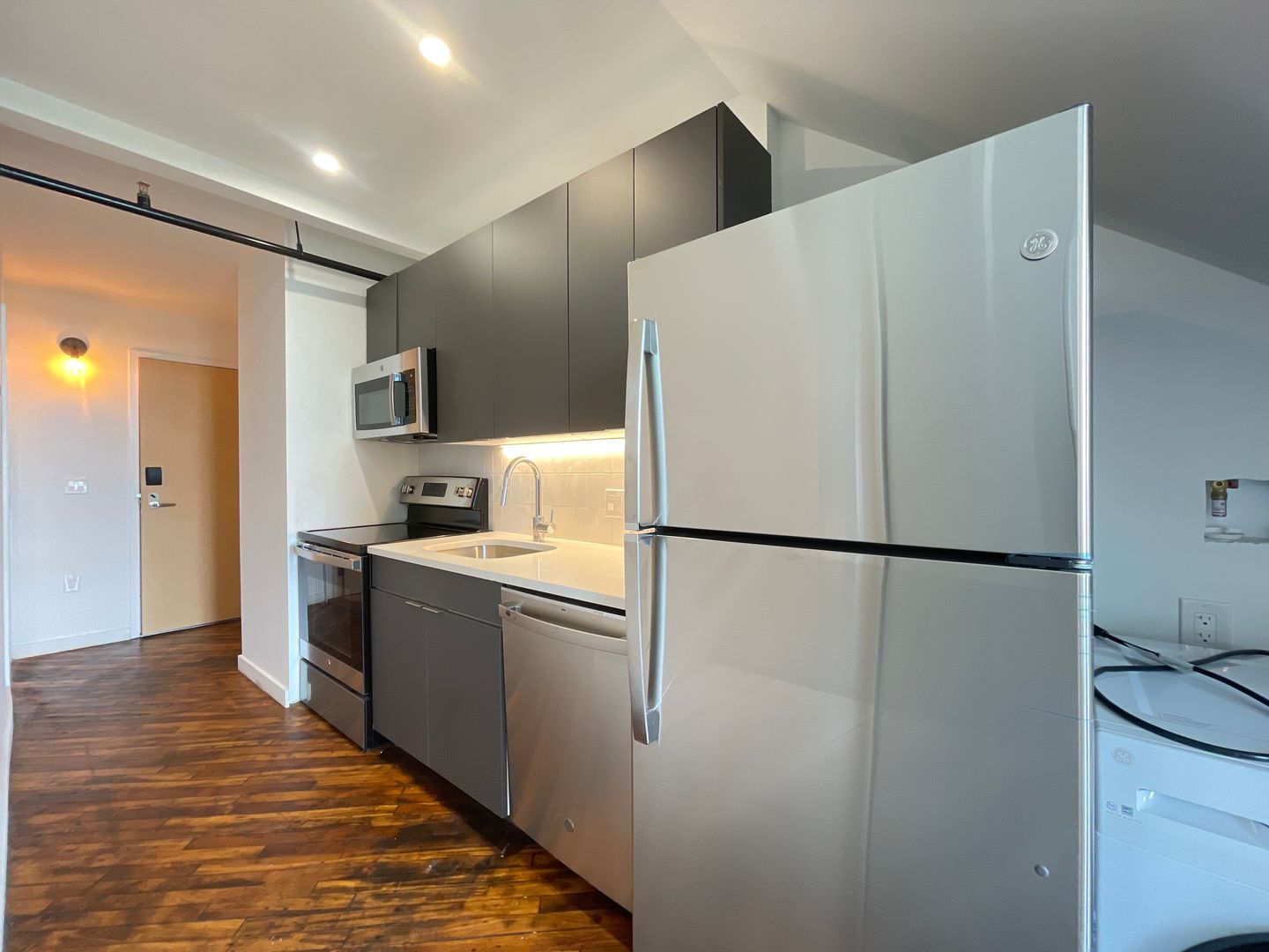 Terrific 1 bed 1 bath loft style apartment with modern features! Featuring hardwood flooring throughout, tall ceilings and windows, and lofted area. Beautiful kitchen space with stone countertops and stainless steel appliances including stove/oven, dishwasher, microwave and full-sized refrigerator. Updated bathroom with tasteful finishes. In unit washer dryer makes Sunday laundry day a breeze!