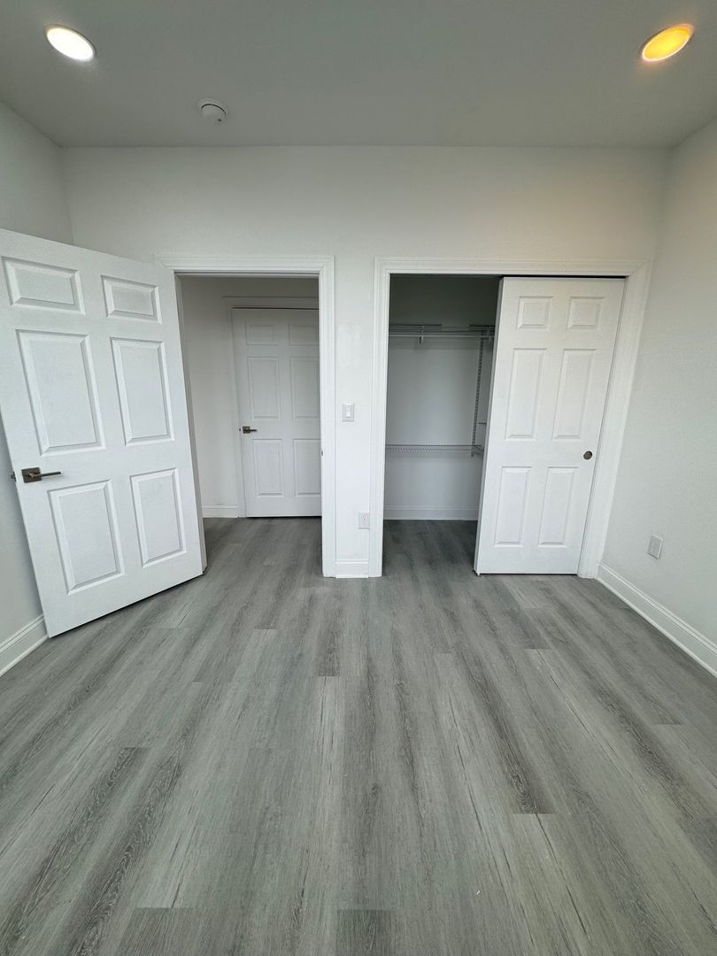 Large bedroom with plenty of closet space for your wardrobe and sneaker collection. Sun drenched bedroom with near to ceiling windows.