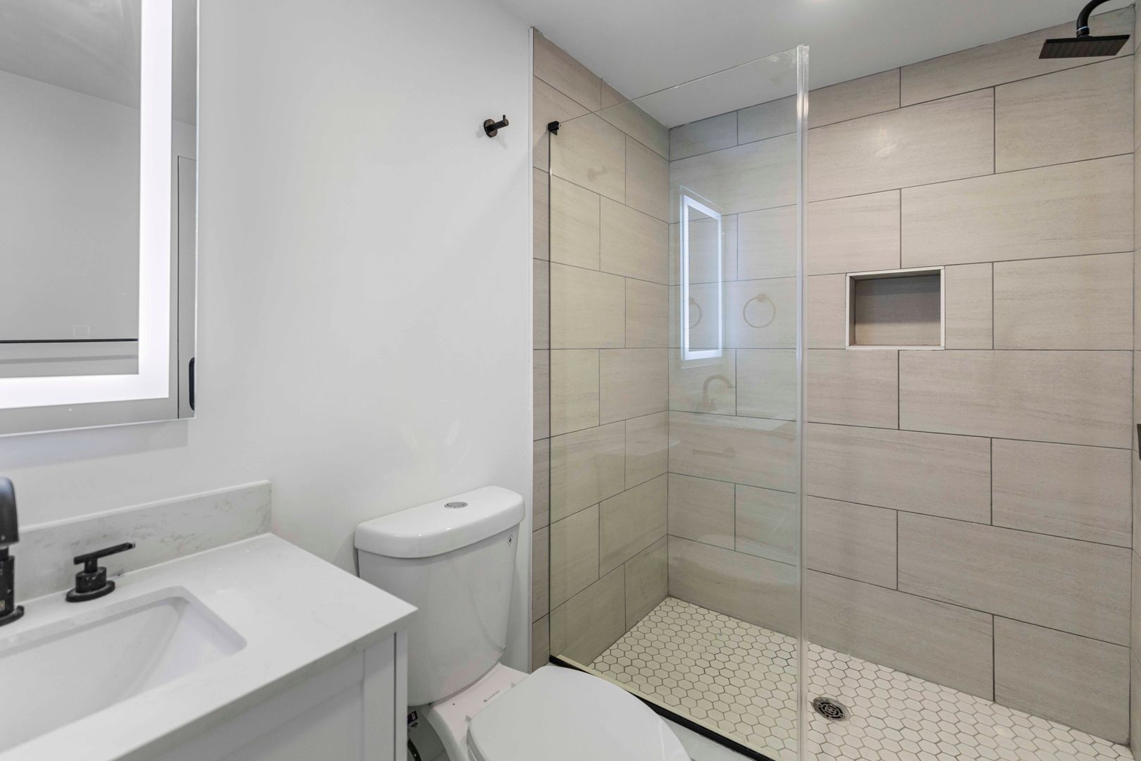 Bedrooms are spacious and bright with ample closet space. The sleek bathroom includes a contemporary vanity, a large glass-door shower, and the convenience of in-unit laundry.
