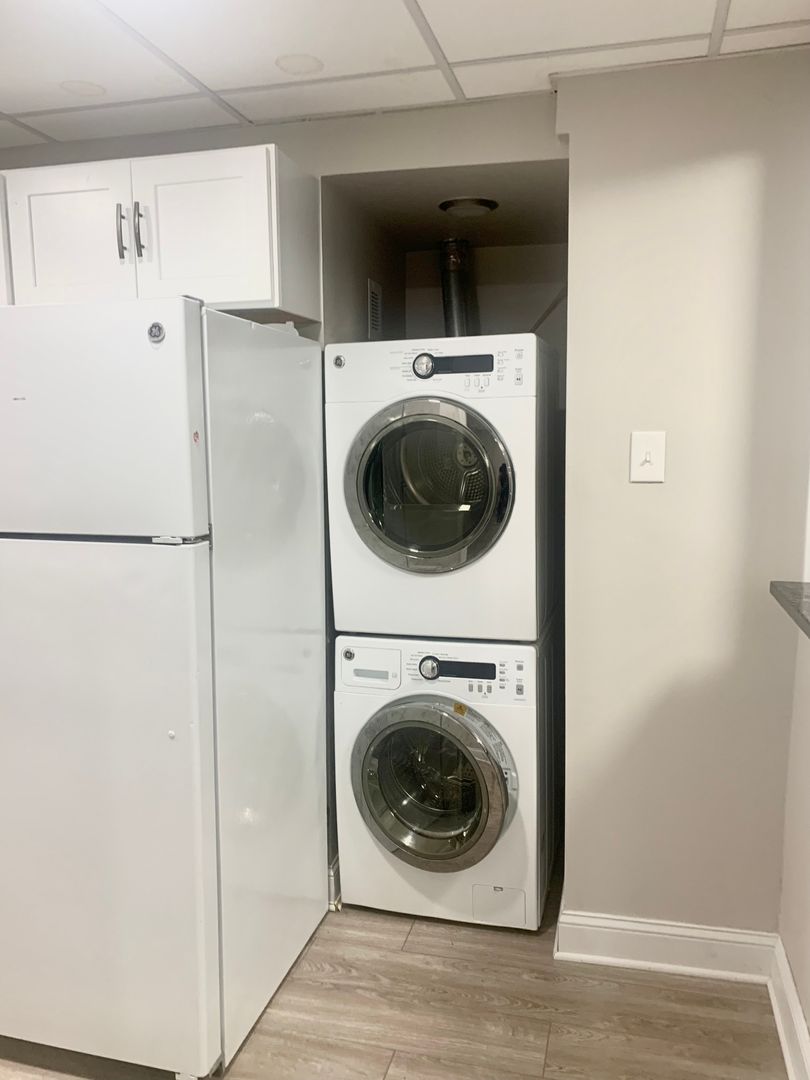 Kitchen features newer appliances including a dishwasher, garbage disposal and a microwave and range. Washer and dryer in unit!